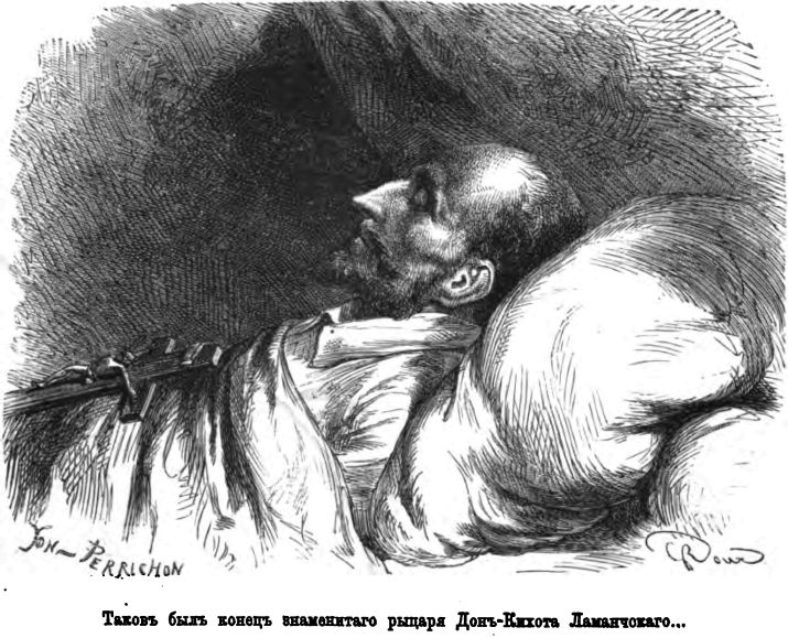 Донъ-Кихотъ поспшилъ снять съ себя плащъ и покрылъ имъ Санчо, преспокойно проспавшаго потомъ до зари, — оставшись самъ въ одномъ камзол. Днемъ они продолжали путь и отошедши мили три, остановились въ одной деревн гд провели ночь въ деревенской корчм, принятой Донъ-Кихотомъ за корчму, а не за замокъ, съ рвами, подъемными мостами, башнями, ршетками; нужно замтить, что со времени своего пораженія Донъ-Кихотъ какъ будто нсколько образумился. Рыцарю и оруженосцу предложили комнату внизу съ окнами, украшенными въ вид занавсей — двумя кускани старой, разрисованной саржи, какая обыкновенно бываетъ въ мод въ деревняхъ. На одной изъ нихъ, изображено было похищеніе Елены, на другой исторія Энея и Дидоны, подававшей простыней съ высокой башни знаки своему убгающему любовнику, уносившемуся на всхъ парусахъ на какомъ-то фрегат или бригантин. Разсматривая ихъ Донъ-Кихотъ замтилъ, что Елена изподтишка улыбалась и отправлялась безъ особенной, повидимому, горести, прекрасная же Дидона проливала слезы величиною въ орхъ. «Эти дв даны», сказалъ онъ внимательно разглядвъ ихъ, «очень несчастны тмъ, что родились не теперь, а еще боле несчастливъ я, не родившись въ ихъ время; еслибъ я встртилъ этихъ прекрасныхъ господъ, Троя не была бы сожжена, Карагенъ не былъ бы разрушенъ; мн довольно было убить Париса, чтобы предотвратить вс эти бдствія».