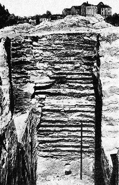Но наиболее сложным и грандиозным примером срубной внутривальной конструкции являются валы «города Ярослава» в Киеве, построенные в 30-х годах XI в. при Ярославе Мудром. Хотя древние валы Киева сохранились лишь на нескольких участках, да и то менее, чем наполовину своей первоначальной высоты, обнаруженные здесь дубовые срубы имеют около 7 м в высоту (рис. 6). Первоначально же эти срубы поднимались, как и весь вал, на высоту от 12 до 16 м. Срубы киевского