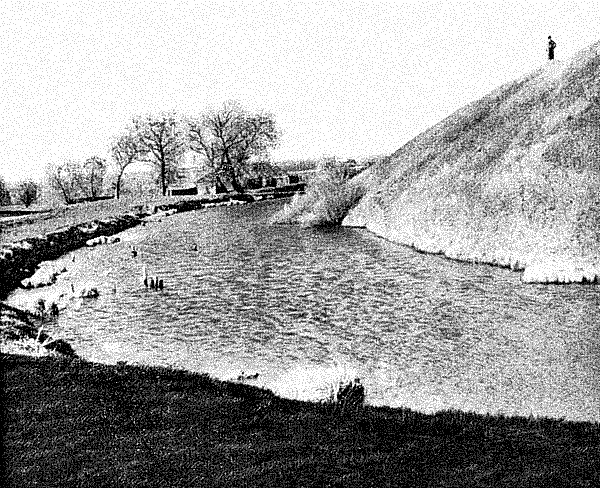Рвы в русских крепостях XI–XII вв. обычно имели симметричный профиль. Уклон их стенок был равен примерно 30–45° к горизонту; стенки рвов делали прямыми, а дно — большей частью слегка скругленным. Глубина рвов обычно была примерно равна высоте валов, хотя во многих случаях для устройства рвов использовали естественные овраги, и тогда рвы, конечно, превосходили по размерам валы и имели очень большую величину. В тех случаях, когда укрепленные поселения возводили в низменной или заболоченной местности, рвы старались отрывать так, чтобы они были заполнены водой (рис. 7).