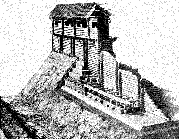 Стены, состоявшие из отдельных, плотно приставленных один к другому срубов, отличались своеобразным ритмом торцов поперечных стенок: каждый отрезок стены, имевший в длину 3–4 м, чередовался с коротким промежутком длиной около 1 м. Каждое такое звено стены, вне зависимости от конструктивного типа, называлось городней. В тех случаях, когда оборонительные валы имели внутри деревянную конструкцию, наземные стены были тесно связаны с ней, являясь как бы ее непосредственным продолжением вверх над поверхностью вала (рис. 8 б).