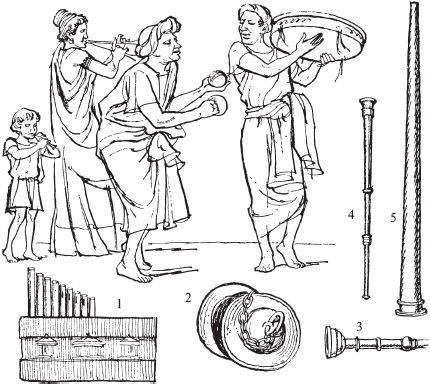Рис. 49. Уличные музыканты и музыкальные инструменты: 1 – свирель; 2 – кимвал (тарелки); 3, 4 – флейта; 5 – труба