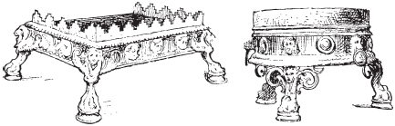 Кроме редких и дорогих золотых и серебряных чаш, блюд и других сосудов, украшающих буфеты, богачи обычно владели полным набором серебряных ложек – главный, если не единственный, римский столовый прибор, поскольку ножи и вилки, или трезубцы, использовались на кухне, но не за столом. Еду брали пальцами или ложками. Остроконечные ручки маленьких ложек гости использовали, чтобы извлекать улиток и моллюсков из их раковин, в то время как сами ложки применяли для того, чтобы есть яйца; ложки большего размера, похожие на наши десертные, отвечали всем требованиям, для которых пальцы не годились.