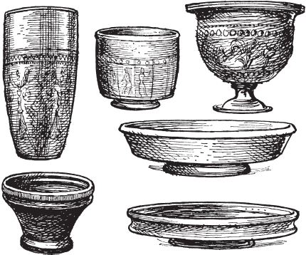 У римлян, как и у греков, не было тарелок в современном смысле этого слова, отсюда необходимость в хлебе, салфетках, а также в рабах, подносящих сосуды с вином и водой и губками, чтобы мыть жирные пальцы и стол между подачей блюд. Роги использовались для питья с незапамятных времен, и с развитием цивилизации их стали украшать искусной резьбой, гравировкой, вставками из серебра, золота и драгоценных камней. Имелись разнообразные чаши, от грубых толстых мисок плебеев, не трескавшихся от кипятка, до кварцевых, которые, если боишься разбить, наверняка разобьешь, как говорил Марциал о «мирровых» чашах, возможно из плавикового шпата с Востока, которые, судя по их цене, могли быть и фарфоровыми. Нерон за такую заплатил миллион сестерциев. Всевозможные гончарные изделия, формованные, выгравированные и без украшений, наряду с драгоценными изделиями древнегреческих серебряных дел мастеров, гравированная и покрытая инкрустациями старинная серебряная и золотая столовая посуда высоко ценились состоятельными людьми.