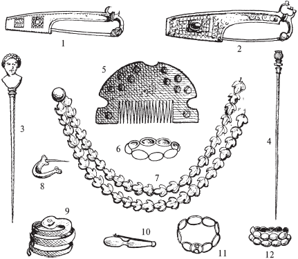 Рис. 8. Драгоценные украшения: 1, 2 – булавки; 3, 4 – шпильки из слоновой кости; 5 – узорчатый гребень; 6, 9, 11, 12 – браслеты; 7 – ожерелье; 8, 10 – серьги