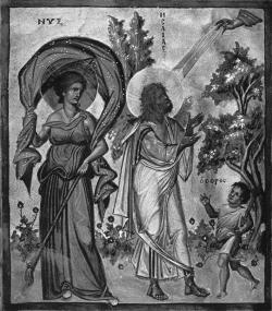 Стиль изображения соответствует XIV веку, что и должно быть по «византийской» волне. В руках богини, как полагают, факел. Но факел никто так не держит. Нечто, изображенное в ее руке, подходит к описаниям первых ружей, скованных железными обручами и с пламенем из дула. Возможно, художник рисовал картину на основе устных рассказов, никогда самого ружья, в силу редкости этого изделия, не видев.