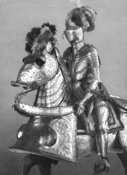 Цельные металлические доспехи появились лишь с изобретением пороха и применением его в военных целях. Если в XIII веке в итальянских регионах, «подражающих» древним римлянам как в гражданских модах, так и в оружии, металлическое вооружение было относительно легким, так что полные доспехи весили не более 30–40 фунтов, то затем вес их стал значительно увеличиваться. С конца XIV века доспехи стали делать толще,