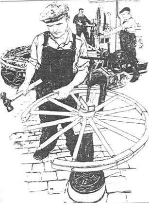 «Молотком и струбциной пользуется колесный мастер. Сначала он собирает ступицу колеса, затем спицы, каждую из которых изготавливает вручную, вбивает в ступицу молотком. Обод колеса собирается из секций и укрепляется на спицах. На обод надевается нагретый стальной бандаж. Остывая, он слегка уменьшается, стягивает колесо и упрочняет его».