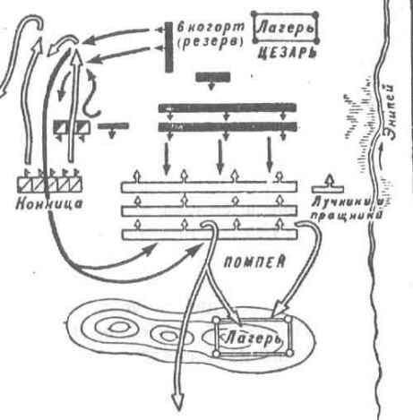 Помпей приказал своим легионам ждать атаки противника, не двигаясь с места. „Говорили, что такой совет дал ему Г. Триарий, указавший, что первый бурный натиск неприятельской пехоты должен будет сломиться, фронт растянется и только тогда его солдаты должны будут в сомкнутых рядах напасть на разрозненные неприятельские части. При этом он (Помпей) надеялся, что неприятельские копья будут причинять меньше вреда, если солдаты останутся в строю, чем если сами пойдут навстречу неприятельским залпам, а вместе с тем солдаты Цезаря от двойного пробега дойдут до полного изнеможения. Но, по нашему мнению, — пишет Цезарь, — Помпей поступил без всяких разумных оснований: ведь у всех людей существует как бы врожденная возбудимость и живость, которая еще более воспламеняется от желания сразиться. Этот инстинкт полководцы должны не подавлять, но повышать. Недаром издавна установился обычай, по которому со всех сторон раздаются сигналы и все до одного поднимают крик: предполагается, что это устрашает врагов и возбуждает своих“. [28] Контратакуя с фронта расстроенные легионы противника, Помпей полагал своей конницей и легко вооруженной пехотой одновременно нанести удар во фланг и тыл наступавшим легионам Цезаря.