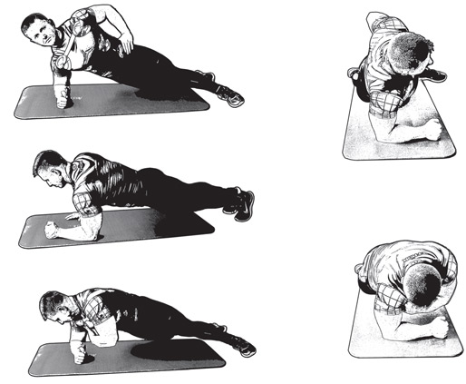 Стоя на правом локте и упираясь стопами в пол, примите такое положение, чтобы между бедром и корпусом образовалась прямая линия. Вторую руку держите на поясе. Задержитесь в таком положении на несколько секунд и затем начинайте выполнять наклоны вниз и вверх, добавив скручивания вовнутрь.