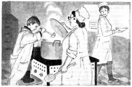 Тут Олешек огляделся и сразу узнал всех своих знакомых поварих и судомоек. Они весело смеялись, и кто-то уже сунул ему в руку большой кусок сладкого пирога с вареньем.