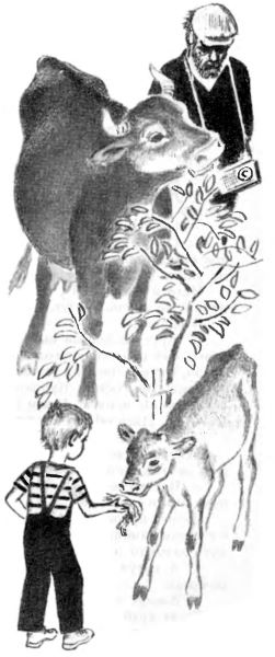 Матвей срывает клок травы и протягивает маленькому бычку. Тот берёт траву осторожно мягкими губами, потом вдруг дёргает травинки и жуёт. Матвей гладит его шелковистую морду, твёрдые бугорки на лбу, где вырастут рожки.