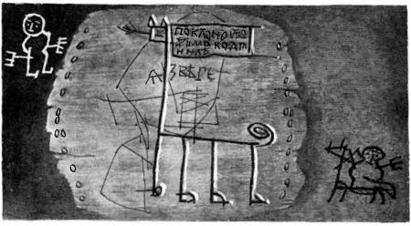 Они поскорей перешли к той берёсте, которую он разглядывал. На ней была нарисована удивительная фигура, и правда не то лошадь, не то жираф. Туловище длинное, прямое, будто сложено из спичек, и под ним четыре прямые, как спички, ноги — все в ряд. И шея длинная, как у жирафа, но прямая, как палка, а на ней маленькая четырёхугольная голова. И только хвост закручен колечком, и в него вставлен плакат, а на плакате нацарапано…