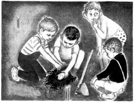Пискля сразу увидал, что под дёрном ворочается дождевой серый червяк, и сказал, что ему, Пискле, никак невозможно руки пачкать, у него в руках важный свёрток. А Матвей не боялся ни червей, ни жуков, он уцепился за толстый, проросший дёрн и держал его на весу, хотя было тяжело. Панков вырыл под дёрном пещерку.