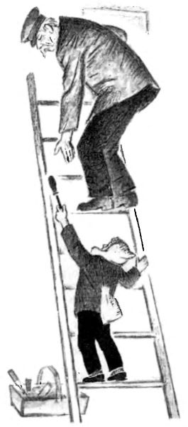 Легко поворачивать направо и ещё раз направо, когда знаешь, где твоя правая рука. Но ведь Никита слизнул отметину. Значит, дорогу надо спросить у прохожих. Прохожие идут быстро. Только один старый человек с длинными седыми усами никуда не торопится. Но он стоит высоко на приставной лестнице, там, где начинаются окошки второго этажа, и стучит молотком.