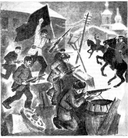 — Нет, внучек, бомбы потом пошли в дело. А в тот раз — ломы железные, топоры, пилы. Подпилили мы фонари и повалили их поперёк трамвайных рельсов. А как поддели трамвайный вагон ломами да как ухнул он наземь, только снежная пыль поднялась! Смотрим — бегут со всех сторон люди, наши, пресненские! Тащат доски и ставни, катят бочки, ворота с петель снимают. Мы сложили всё в груду, трамвайными проводами оплели, и выросла баррикада — ни пройти ни проехать. А наверху подняли знамя…