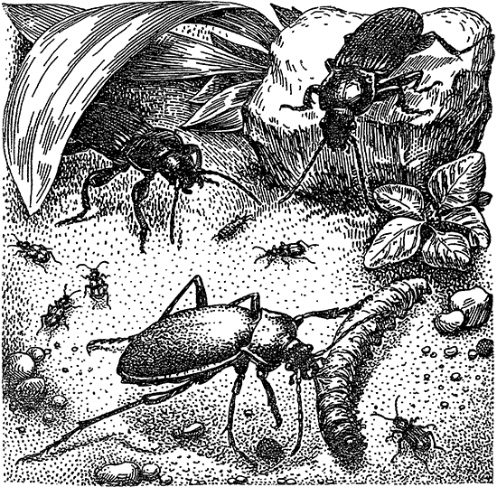 Жуки и бабочки — самые многочисленные по количеству видов насекомые. Жуков известно почти 500 тысяч видов, бабочек — немногим меньше. Но если среди бабочек хищники редки, то жуков-хищников масса. Семейство жужелиц насчитывает в нашей стране около двух с половиною тысяч видов, и хотя среди них некоторые растительноядны, все остальные — хищники и питаются гусеницами, личинками жуков, кобылками, улитками. Уничтожают они и злейших вредителей леса: гусениц подгрызающих совок, проволочников, личинок колорадского жука, гусениц бабочек. И личинки и взрослые жуки хищничают в одинаковой мере и питаются, в общем, одинаково. Полезная деятельность жужелиц объясняется еще и их многочисленностью.