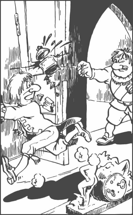 Вскоре главный советник явился с Книгой законов — огромным фолиантом, от которого пахло плесенью и пылью и который был заперт на серебряный замок. Чтобы открыть его, нужно было отыскать ключ. На это ушло немало времени, но наконец ключ появился, главный советник отпер замок и раскрыл том. Все пять толстяков-советников сгрудились, уставясь в книгу, и вскоре Пуллипуп ткнул своим толстым пальцем в строки и воскликнул:
