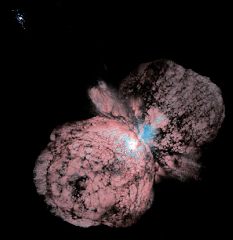 Посередине между этими двумя гигантскими пузырями находится звезда Эта Киля ( Carinae), которая примерно в сто раз больше Солнца. Свет Эты Киля достигает Земли за 8000 лет.