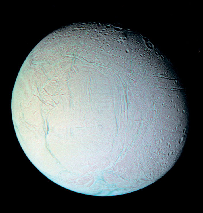 Ультрафиолетовое, зелёное и инфракрасное комбинированное изображение Энцелада – шестого по величине спутника Сатурна. Температура его поверхности – примерно минус 200 °С, но под поверхностью, возможно, есть жидкая вода.