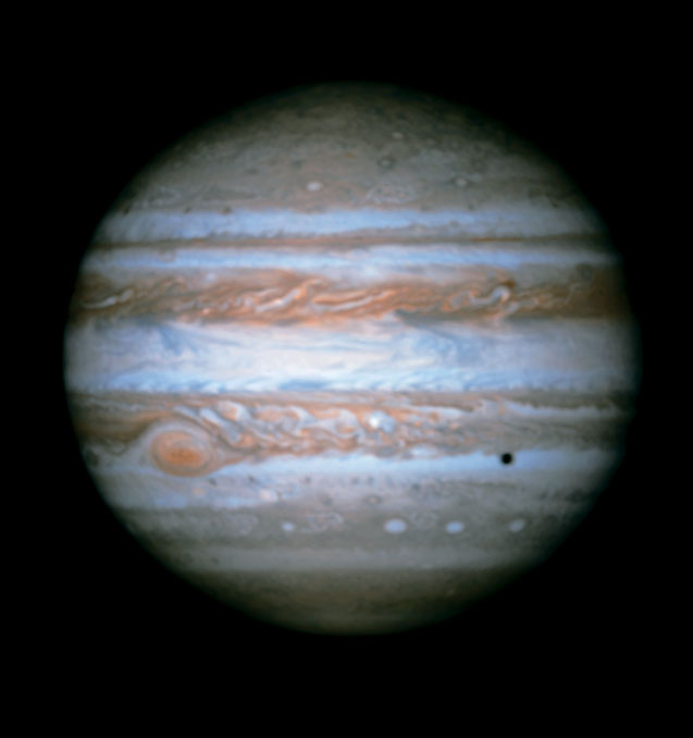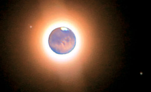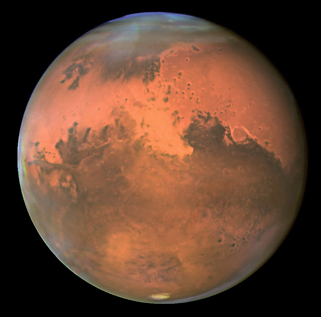 Марс. Оранжевая область в центре – гигантская пылевая буря, а голубовато-белые области сверху и слева – облака водяного льда.