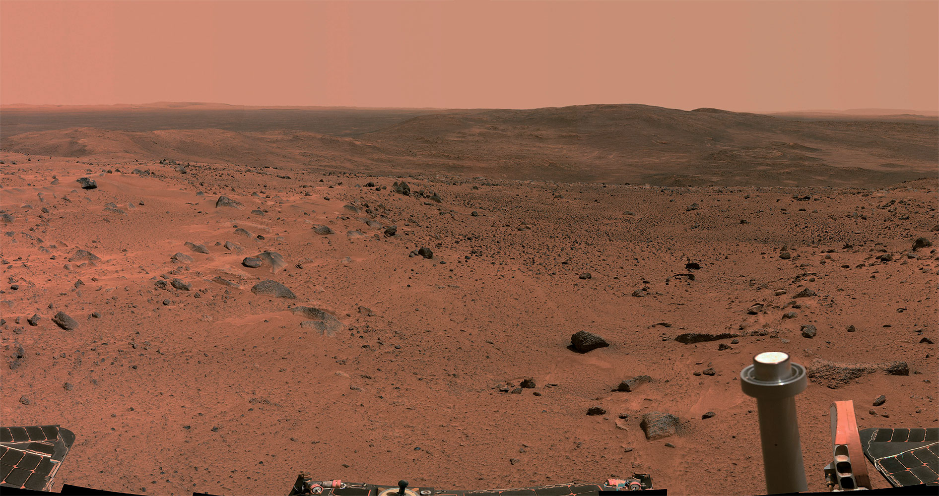 Панорама Марса с вершины холма Хазбенда, самого высокого среди Холмов Колумбии. Эти холмы получили свои названия в честь астронавтов, погибших при взрыве космического корабля «Колумбия». Снимок сделан в 2005 году марсоходом «Спирит».