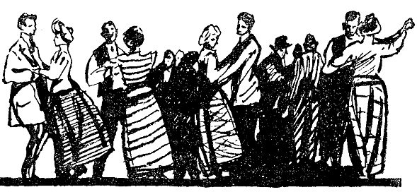И вот со смехом, с криками, с беспрерывными шутками и остротами гости усаживаются за стол. Молодые люди, которые беспорядочно толпились у дверей, собираются с духом и подходят поближе; старики бранят и подталкивают смущающегося Юргиса, пока он, наконец, не решается занять место по правую руку новобрачной. За ними следуют обе подружки невесты, которых можно узнать по их эмблемам — бумажным венкам, а дальше все остальные гости, стар и млад, юноши и девушки. Свадебное веселье заражает величавого буфетчика, и он снисходит до жареной утки; даже толстый полисмен — позже ему предстоит разнимать дерущихся — придвигает стул к нижнему концу стола. Дети орут, младенцы пищат, все смеются, поют и болтают, а кузина Мария, покрывая своим голосом оглушительный шум, выкрикивает распоряжения музыкантам.