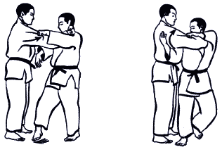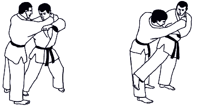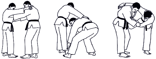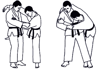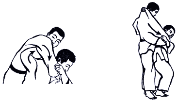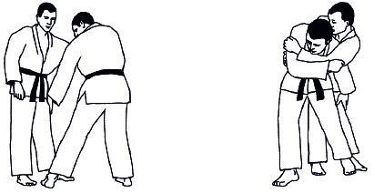 При захвате за разноименный рукав и разноименный отворот проводится Сеои-наге (метание взваливанием) (рис. А-12а). Однако использование такого захвата на старте броска в соревновательных схватках чревато поражением, так же, как и другого стартового положения при проведении бросков Тсури-коми-госи (рис А-12б).