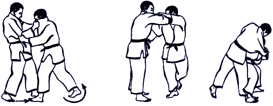 Выход на старт броска «уходом» – с разворотом на носке впереди стоящей ноги увести сзади стоящую ногу назад по кругу так, чтобы она стала снаружи одноименной ноги противника (рис. А-4а, б).