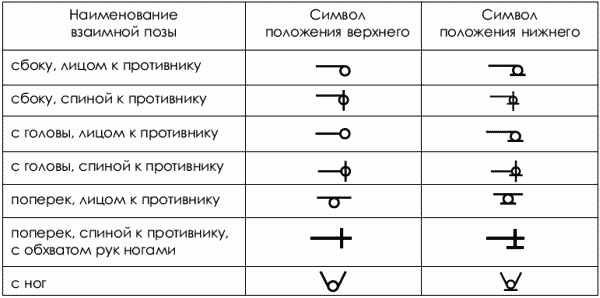 Этот раздел борьбы предусматривает обязательное положение одного из борцов лежа на спине, боку, мосту и другого – на животе, боку, спине, четвереньках. Положения классифицируются с учетом расположения верхнего относительно нижнего, лежащего на спине, а символы – с учетом наблюдения сверху (табл. 1.3).