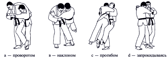 Тип «d» (запрокидываясь, или «запрокидывания») – броски противника назад, за себя, с предварительным поворотом в сторону, противоположную броску (рис. 1.3г).