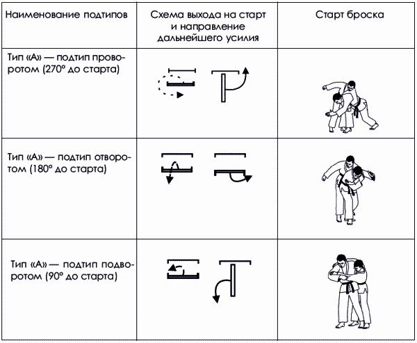 В бросках типа «а» классы составляют способы выхода на старт, и связанные с этим порядок и направление перемещения атакующего и его плечевой оси относительно противника (табл. 1.6)