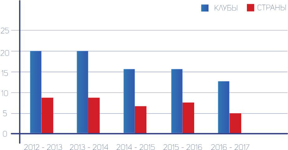 КОЛИЧЕСТВО КЛУБОВ И СТРАН В ЕДИНОЙ ЛИГЕ ВТБ ЗА ПОСЛЕДНИЕ 5 СЕЗОНОВ