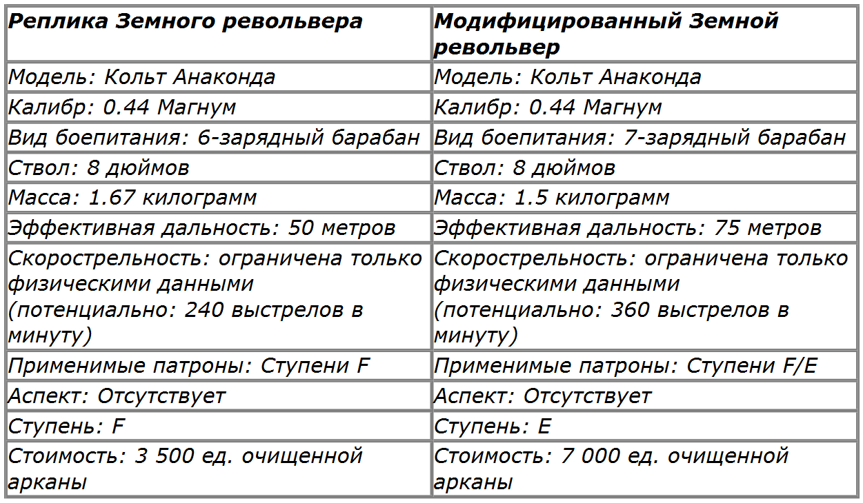 Каждая позиция представлена тремя видами — тремя ступенями. От самой дешёвой F до самой дорогой D. Кольт Анаконда, доставшийся мне от Говнюка, стоит 3 500 единиц очищенной арканы. Он же со ступенью E — уже 7 000, а с D — 15 400.