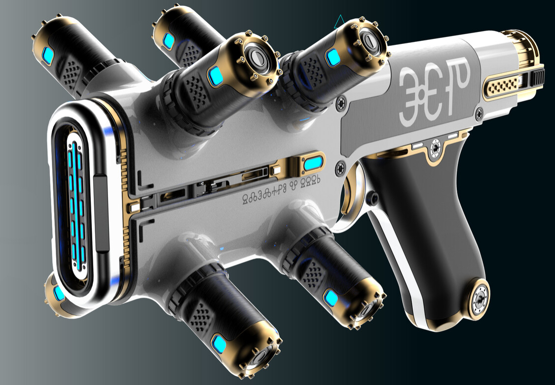 Вернувшись, он кладёт передо мной футуристического вида пистолет[3]. Чёрная рукоять и белоснежный вытянутый по вертикали ствол. В нём имеется четыре порта, из которых торчат… что-то вроде батареек или аккумуляторов.