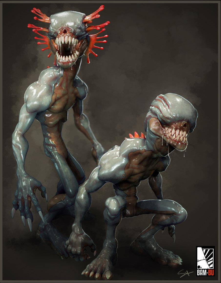 Ростом монстры едва достают до моего бедра, зато в пасти столько клыков, что акула почтительно снимет шляпу, да и когти внушают. Тельца человекоподобные, худощавые, но с развитым плечевым поясом. Шкура грязно-серая, а по спине идут алые гребешки. Точно такие же алые отростки на долю секунды высовываются из продольных разрезов на боку их черепов. Безглазых черепов. Зрелище отталкивающее и не вызывает ничего кроме брезгливости.
