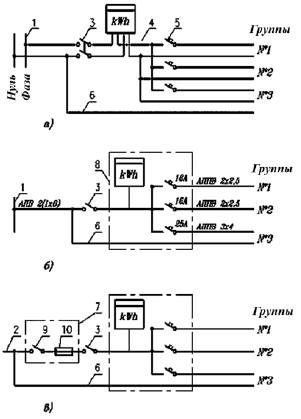 а – многолинейная; б – однолинейная с воздушным вводом; в – однолинейная в варианте с кабельным вводом; 1 – воздушная линия; 2 – кабельная линия (выполняется по проекту наружных сетей); 3 – двухполюсный пакетный выключатель; 4 – счетчик; 5 – выключатель автоматический; 6 – провод для зануления; 7 – вводной ящик; 8 – квартирный щиток; 9 – рубильник; 10 – предохранители