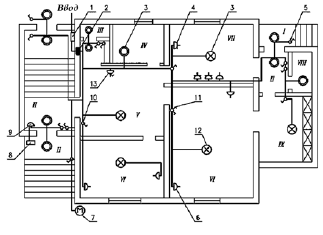 I– крыльцо; II – тамбур; III – санузел; IV – помещение для стирки; V – прихожая; VI – жилая комната; VII – кухня; VIII – кладовая; IX – веранда; 1 – силовой ящик; 2 – квартирный щиток; 3 – одно– или двухламповый светильник; 4 – штепсельная розетка с защитным контактом; 5 – однополюсный герметический выключатель; 6 – штепсельная розетка без защитного контакта; 7 – милицейский фонарь; 8 – кнопочный выключатель (кнопка) для звонка; 9 – звонок; 10 – однополюсный выключатель; 11 – сдвоенный выключатель; 12 – многоламповый светильник с раздельным включением ламп; 13 – штепсельная розетка с выключателем