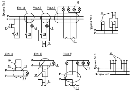 Групповую сеть, чаще используемую в приусадебных постройках, выполняют однофазной и монтируют, как правило, тремя группами. Группа № 1 предназначается для питания осветительных приборов. Группа № 2 служит для присоединения штепсельных розеток на 6 А без защитных (зануляющих или заземляющих) контактов. Группа № 3 питает электроприемники, требующие занулений корпуса прибора (например, кухонная плита). К данной группе присоединяют штепсельные розетки с защитным контактом.