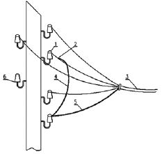 1 – дополнительный изолятор; 2 – трос; 3 – провода ответвления; 4 – зануление троса; 5 – нулевая жила; 6 – изолятор для провода наружного освещения