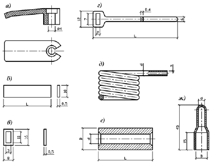 а– скобки У641 и У642; б – полоски; в – пряжки; г – полоски-пряжки; з – электромонтажные трубки; е – гильзы ГАО; ж – изолирующие колпачки