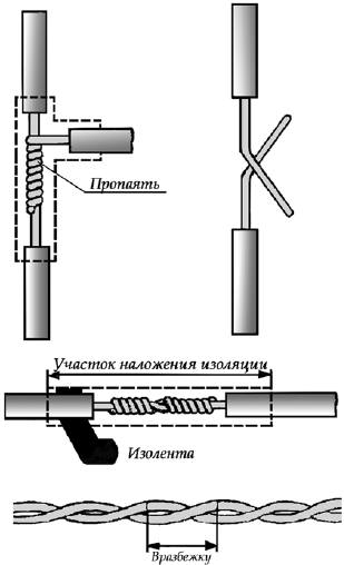 Технология соединения и ответвления медных проводов заключается в следующем. Для соединения 2-х кусков провода необходимо плотно скрутить проволочки токопроводящих жил, чтобы они не раскручивались, и скрестить провода. Концом левого провода делают 8-10 оборотов вокруг правого, а концом правого делают 8-10 оборотов вокруг левого провода, но в другом направлении. Места соединения скруткой должны быть длиною не менее 10–15 диаметров соединительных жил. Соединение обжимают плоскогубцами и пропаивают припоем ПОС-30 или ПОС-40. Пропаянную скрутку изолируют на всю длину соединения с обязательным захватом незащищенной изоляции провода. Соединение между собой двух скрученных проводов выполняют вразбежку.