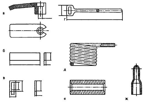 а — скобки У641 и У-642; б — полоски; в — пряжки; г — полоски-пряжки; з — электромонтажные трубки; е — гильзы ГАО; ж — изолирующие колпачки