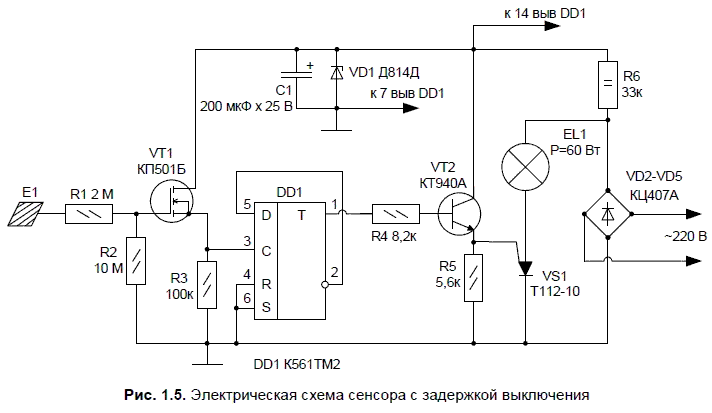 То, что электронное устройство (а тем более сенсорное), где управляющий импульс образуется от наводок переменного напряжения в теле человека, не имеет развязки от сети, теоретически может пугать радиолюбителя, из-за кажущейся опасности передачи через сенсорный контакт переменного напряжения самому человеку. Элементы схемы заземлять не надо. С точки зрения безопасности, эти опасения несостоятельны. Опасности поражения электрическим током здесь никакой нет. Независимо от фазировки подключения в осветительную сеть устройство абсолютно безопасно для повторения и использования. Единственное ограничение: монтаж и проверку правильности соединения элементов надо выполнять при отключенном напряжении, а при подключенном в сеть устройстве нельзя касаться руками и неизолированным инструментом деталей и элементов несущих сетевой потенциал. Рассмотрим схему, показанную на рис. 1.5.