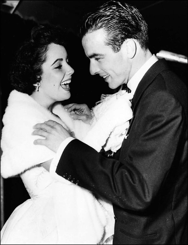 Элизабет Тейлор поправляет бабочку Монтгомери Клифту на голливудской премьере «Наследницы». Октябрь 1949 года