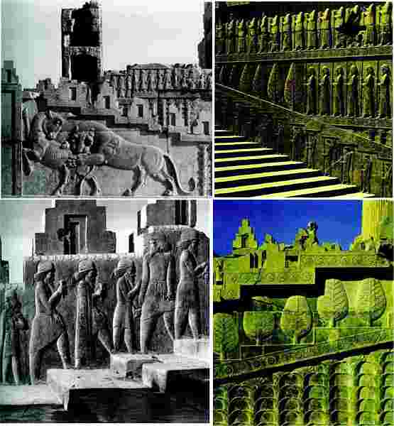 Резчики по камню времён Сасанидов продолжали художественную традицию, сложившуюся в официальном искусстве империи Ахеменидов. Гигантские изображения на рельефах представляли военные триумфы, охоты царя, сцены вручения ему богом венца власти.