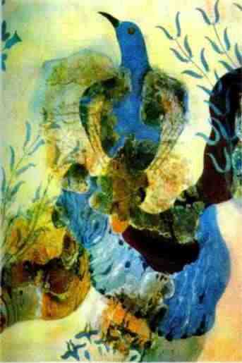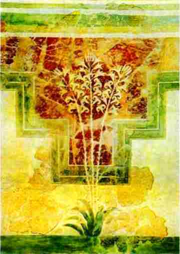 Роль деревьев, трав и цветов в этом мире была настолько велика, что без них не мыслилось никакое человеческое деяние. Их изображения встречаются на Крите повсюду, окружённые ореолом неприкосновенного, тайного, божественного. Растительное царство выступало в двух формах: естественной — природной, пребывающей под опекой богов, и культурной — взращённой человеком в условиях города-дворца. Так, на одной из древнейших кносских фресок «Собиратель крокусов» [16] цветы показаны растущими на естественных горах и холмах. Их звёздчатые кустики населяют и другие росписи, например дивную «Синюю птицу» или «Обезьяну и птицу». Это природный, заповедный мир, где человек всего лишь гость.