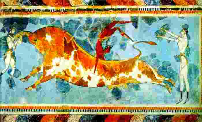 Смысл таврокатапсии — ритуального боя с быком — можно понять благодаря сохранившимся фрагментам росписи, изображавшим эту сцену. Любопытно, что с быком борются не только мужчины, как на корриде в современной Испании, но и женщины. Более того, богиня-женщина и была главным противником бога-быка, своего сына-супруга. Она ежегодно приносила его в жертву на подобном празднике, чтобы он, отживший годичный цикл, мог вновь родиться. Мышление людей доисторической эпохи было цикличным: всё возвращалось на круги своя благодаря божественным ритуалам.