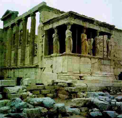 Эрехтейон был достроен позднее, уже около 410 г. до н. э. Он неоднократно перекладывался в XX в. н. э. На фоне грандиозного Парфенона изящный Эрехтейон с тремя различными портиками и статуями кариатид (девушек, несущих перекрытие) кажется волшебной игрушкой. Великое и малое, архаичное и современное, грандиозное и интимное гармонично слилось в Акрополе Афин. Он и сегодня остаётся эталоном естественности, красоты и благородного вкуса.