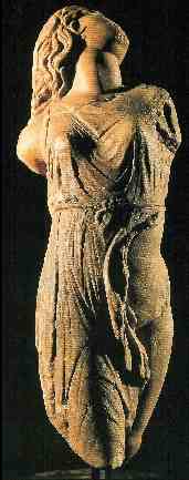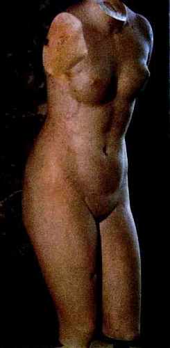 Торс Афродиты Книдской. IV в. до н. э. Римская копия. Лувр, Париж. К счастью, одна из работ великого мастера дошла до наших дней в подлиннике. Это «Гермес с младенцем Дионисом». Группа была посвящена в храм Геры в Олимпии, где её и нашли при раскопках. Утрачены только ноги и кисть руки Гермеса, державшего виноградную гроздь. Гермес, несущий младенца на воспитание нимфам, отдыхает в пути. Фигура бога сильно наклонена, но это не делает скульптуру некрасивой. Она, напротив, овеяна атмосферой неги. Черты лица обозначены не слишком резко, они словно плавятся под действием полуденного солнца. Веки больше не подчёркиваются, и взгляд становится томным, как бы рассеянным. Часто Пракситель ищет для своих фигур дополнительную опору: стволы, пилоны или другие подпорки, как бы не надеясь на силу их собственной тектоники.