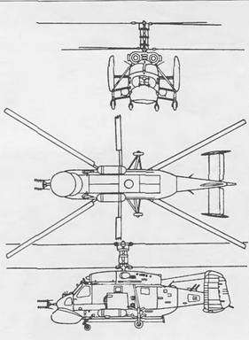 В одном полете экипаж способен контролировать акваторию площадью 1660 км 2, используя опускаемую гидроакустическую аппаратуру и сбрасываемые буи аналогичного назначения, последние увеличивают контролируемое пространство до 2000 км 2. Навигационный комплекс обеспечивает полеты над открытым океаном, над сушей без ориентиров и автоматический вывод машины на обнаруженную подводную лодку. Поисково-прицельная аппаратура «Осьми- ног-Э» выслеживает субмарины в подводном положении, определяет элементы их движения и дает летчикам рекомендации, какой вид оружия целесообразнее применять. При этом оперативная обстановка выводится на специальный индикатор. Для синхронной работы всех подсистем Ка-28 оснащен ЭВМ. Поставлялся в Индию и Югославию.